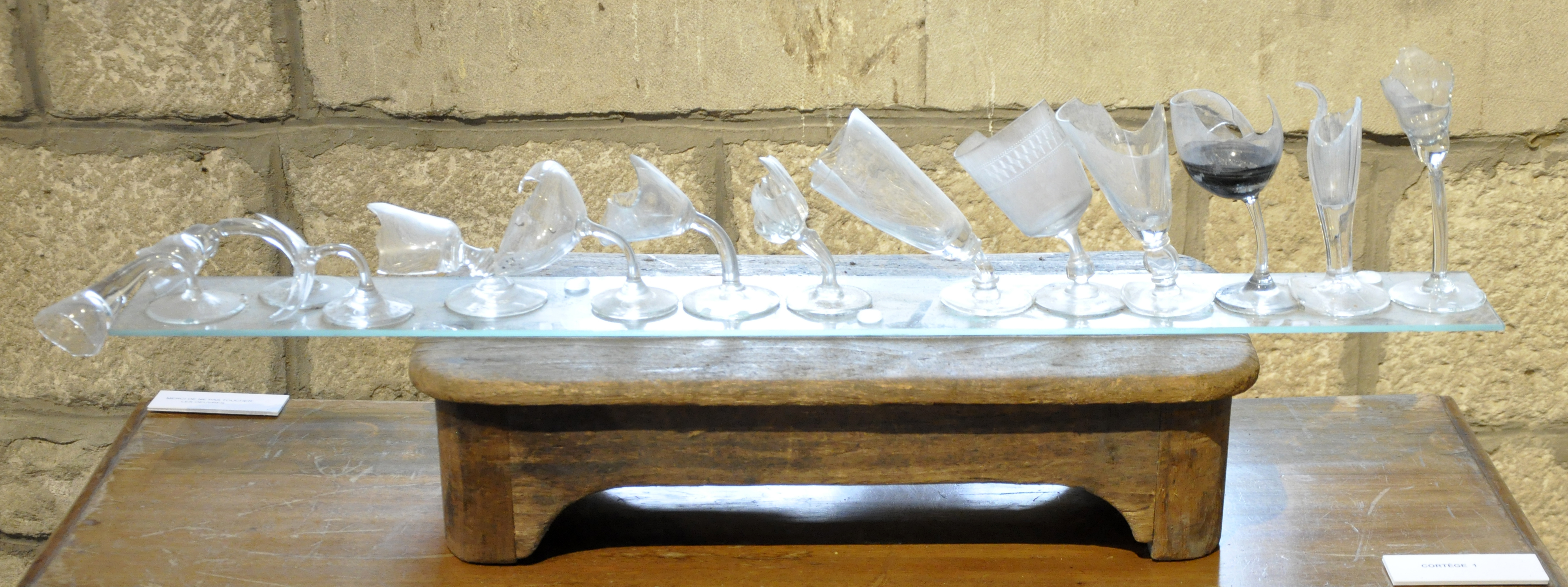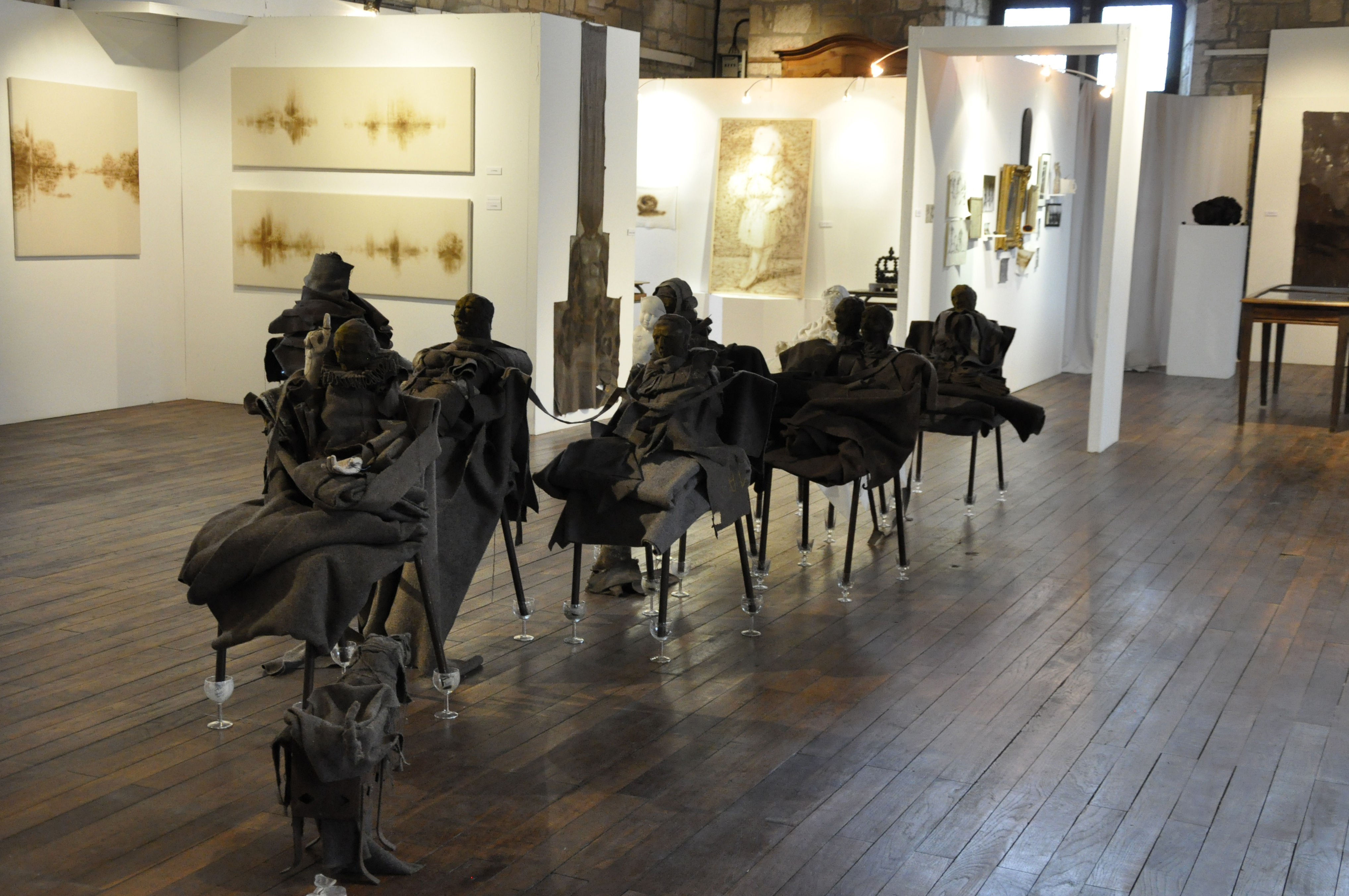 Peintures sur couvertures militaires, brûlures sur laine blanche, terres cuites, modelages textiles, verres et objets…