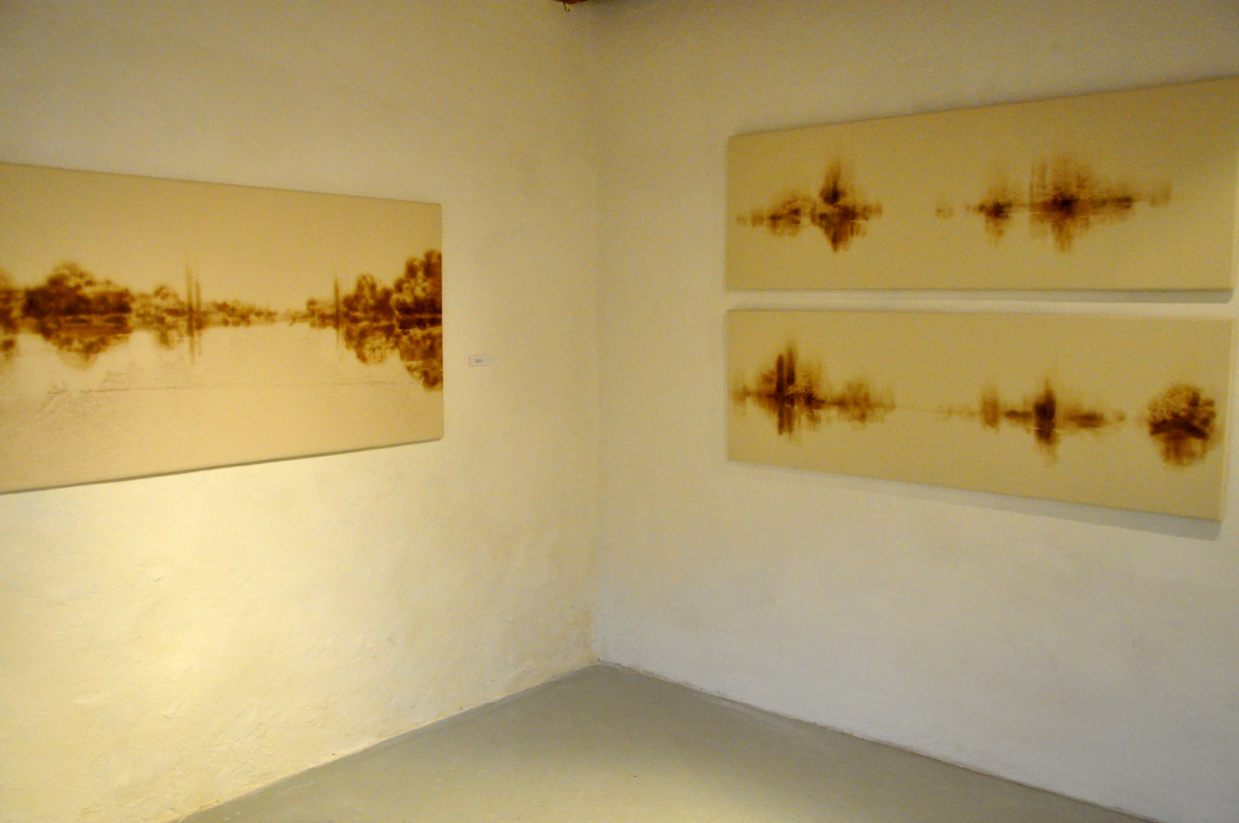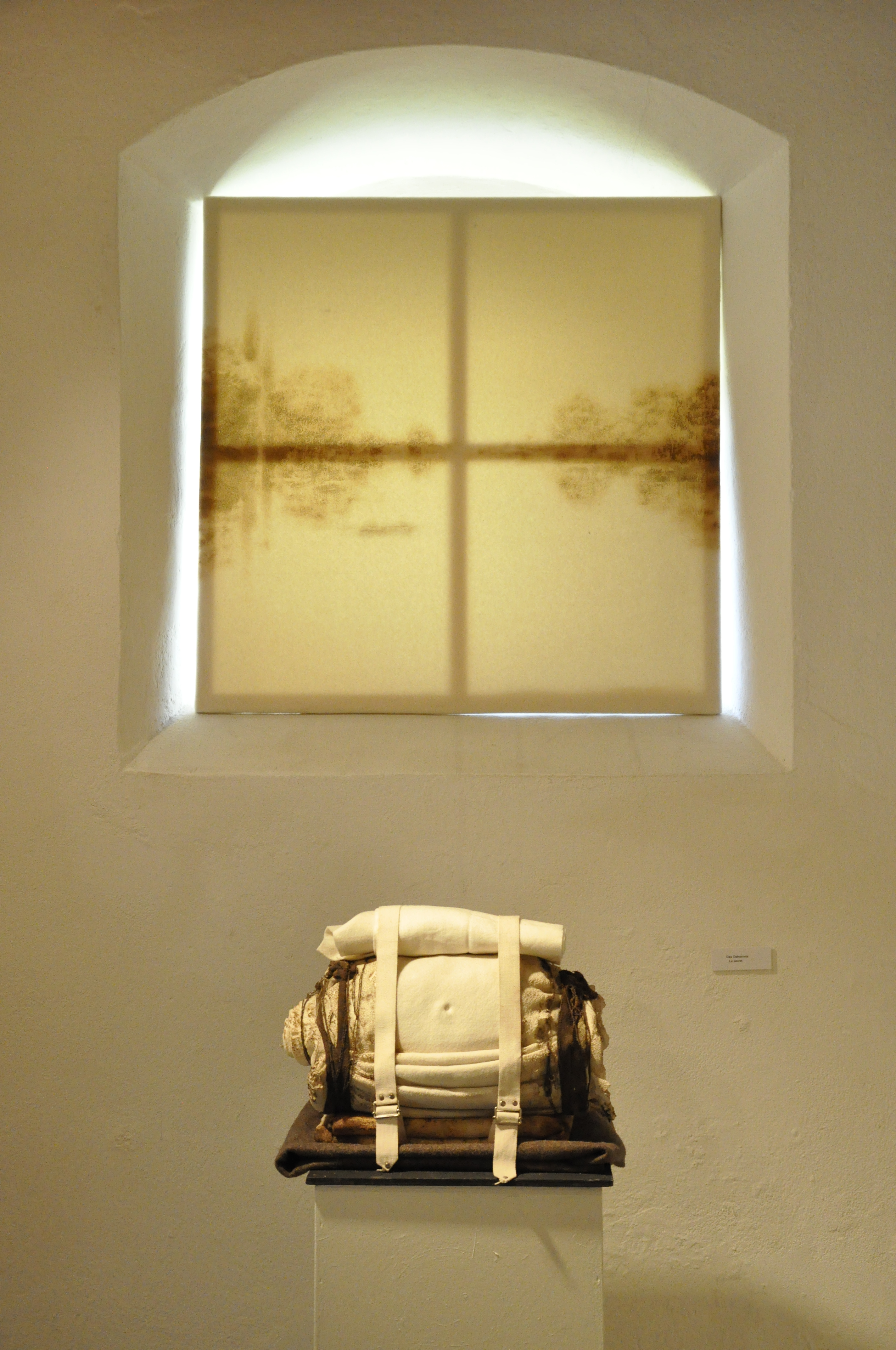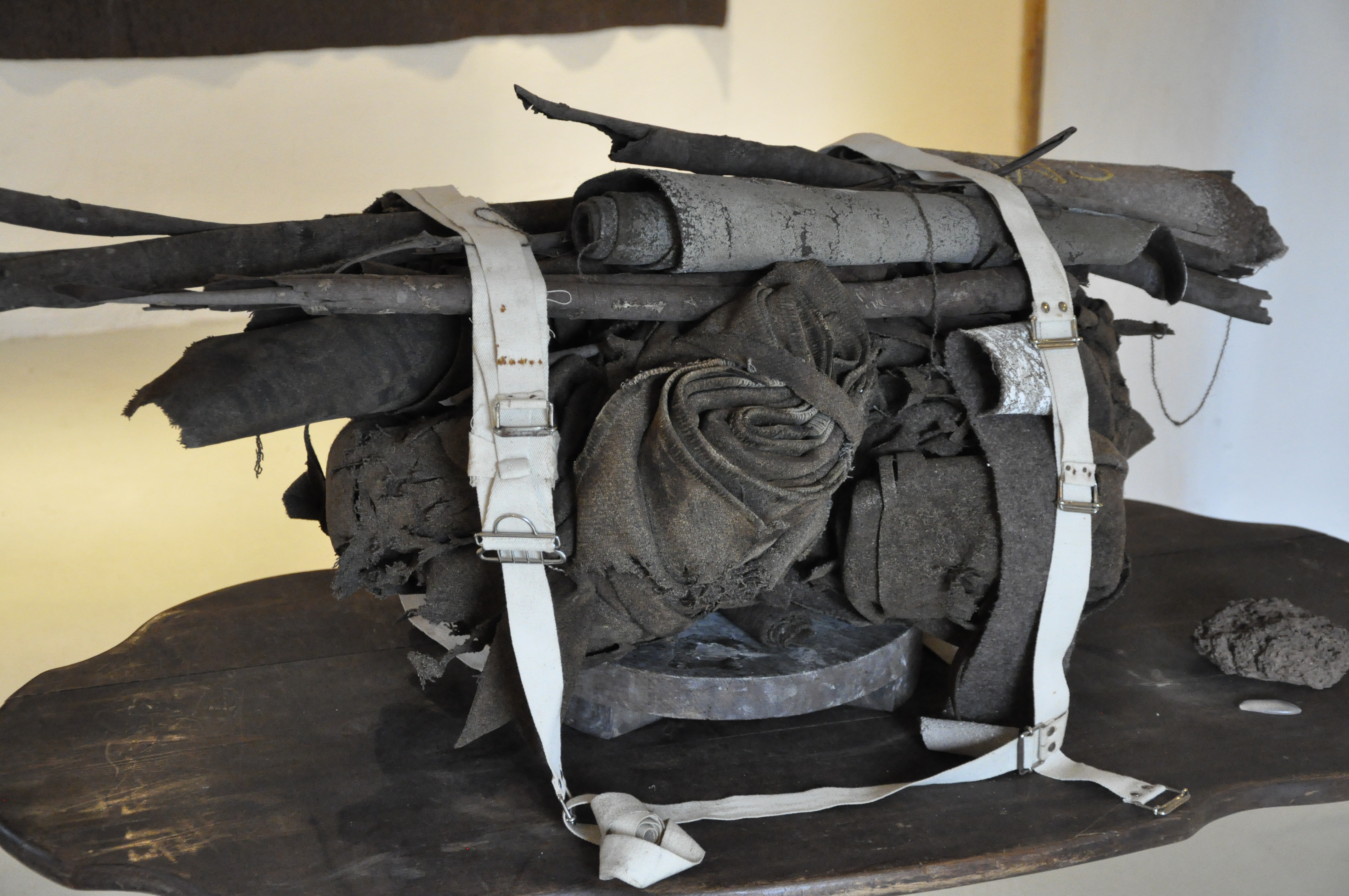 La laine brune usagée des couvertures militaires est peinte avec rudesse et contraste avec celle, blanche, effleurée avec précaution par la flamme. Volumes, objets et assemblages complètent l’installation.